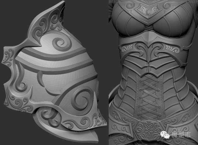 第二种花纹,我通过Edge Loop 和Panel Loop来实现,我复制一个我需要的盔甲模型,对这个模型进行细分,使他能够有足够的面数来帮助我得到我想要的花纹模型,然后我在这个模型上画出我需要花纹的alpha遮罩,画好alpha后,使用快捷键Ctrl+W(把框选的地方快速打组的快捷键),然后应用panel Loops去得到凸起的花纹模型。