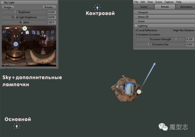 灯光。灯光本来就有基本的HDR贴图和两个自定一光源来构成,但在Marmoset中你可以调整整个环境的亮度,或者降低整个环境的亮度 得到你所想要的效果,