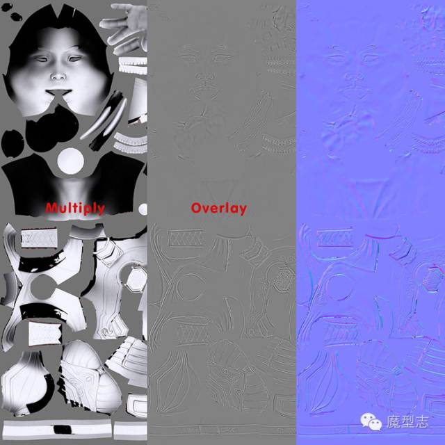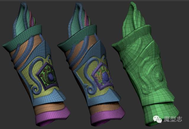 在烘焙处理钱,我决定把每一部分给与一个顶点颜色,这样在烘焙的时候可以烘培不IDmap,在纹理制作的时候,这些ID颜色可以作为mask方便我的选择,以及便于加强某一部分的细节。烘焙我在max里完成,zbrush模型我通过zbrush的减面工具进行处理,这样可以让我很轻松的导入到max里边进行操作。