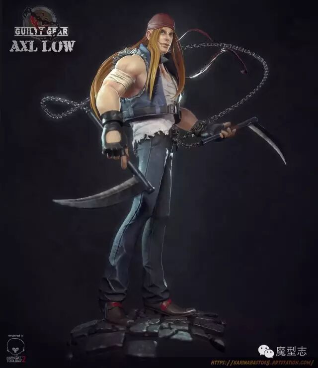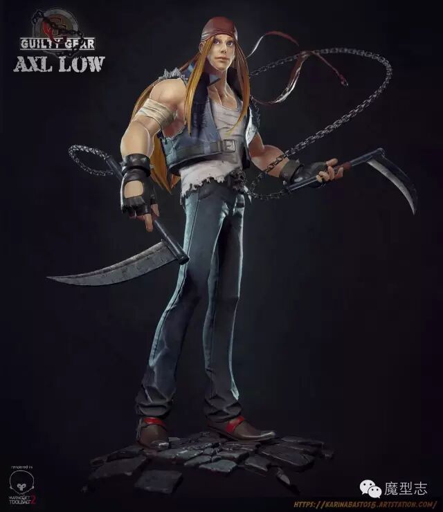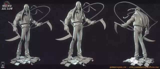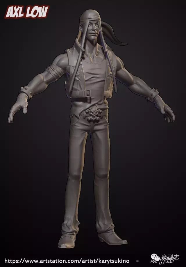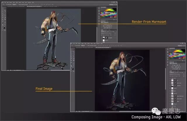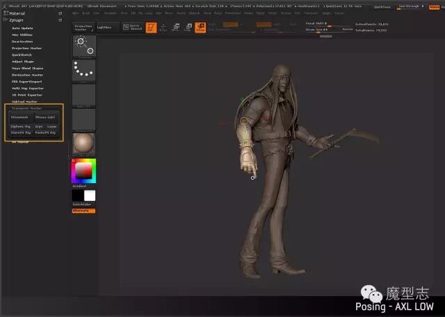 一旦贴图搞定,我会把最后的游戏模型倒到zbrush里,通过Transpose master来进行一个快速的Pose。在这一步,我想要添加武器和基座, 这样可以帮助这个角色看起来更有灵魂,做pose的时候我就开始考虑下一步,渲染的角度。