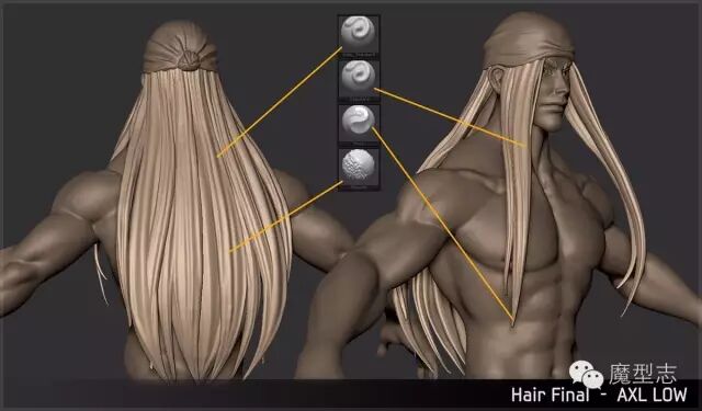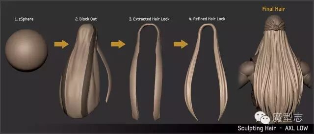 制作头发我一般也是通过一个球拉出一个初始的模型,这样可以做一个头发模型的指引。这样通过这个指引模型我以很方便的去挤压出一个模型来进行雕刻,得到我想要的毛发模型。我会一直重复这一步,直到做出最终的头发的模型。