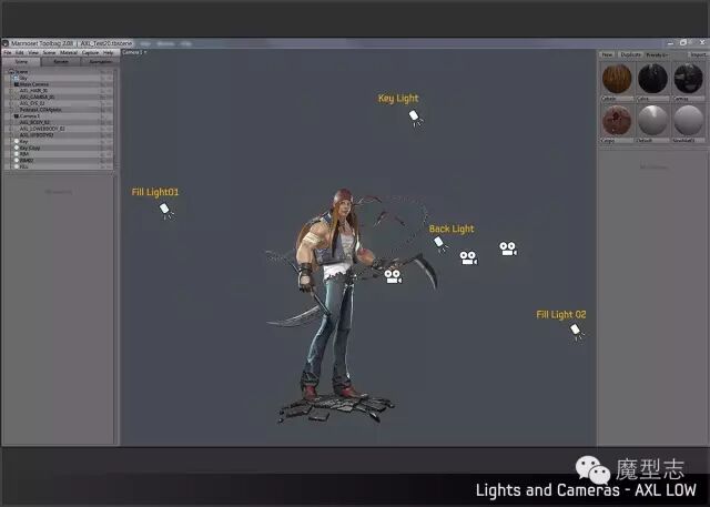 摆好pose的模型我会导出obj到marmoset里边,进行材质的设定,灯光以及摄像机的架设。在这个场景里我使用了传统的三个灯光光照,主光源,补充光源以及背光,我还为脸添加了一盏灯光,这样可以让脸更亮些更突出一些。我也喜欢添加几个摄像机,这样可以做出好几个比较好的角度渲染。