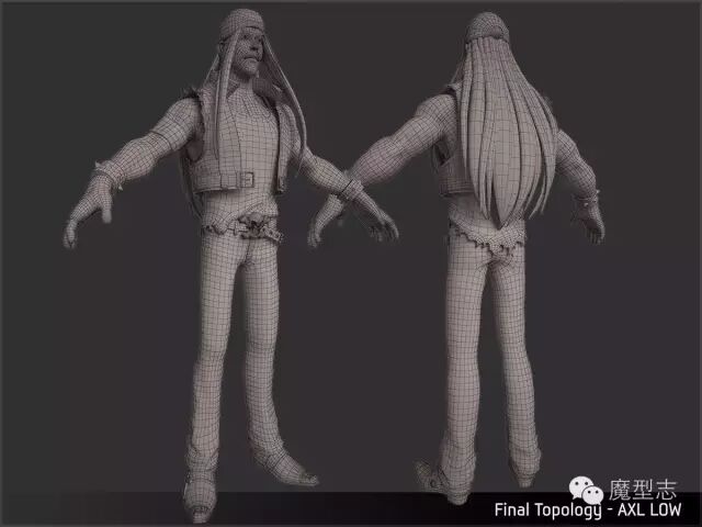 拓扑我会把模型减面,然后倒出到max里来制作,我一般使用max的插件Wrapit(这我没听说过,也别找我要),他可以让我很方便的来制作topo,但是有些部分我会直接用zbrush的remesh来制作,最后在到max里修改下,比如身体还有头发。