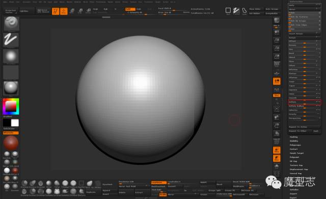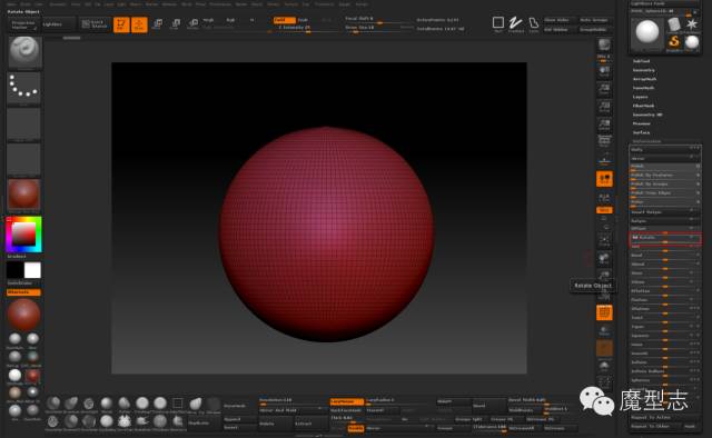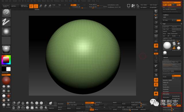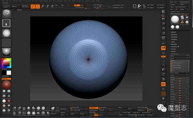 添加一个球体,同样把极点旋转到正面,这里需要用ZREMESHER自动拓扑一下,因为极点在中心会出现高光扭曲的问题,注意勾选两个轴向的对称,勾选SAME保持一样的面数就可以了。这里我点了两次ZREMESHER得到一个我想要的拓扑结构。