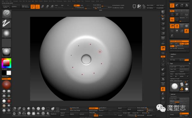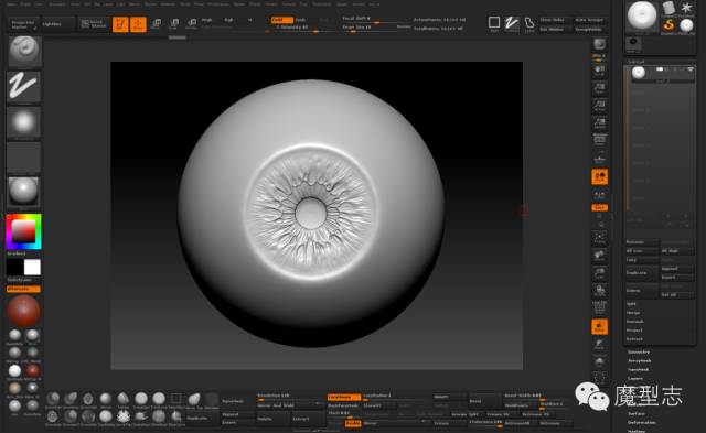 之后细分一下开始做些细节,这里开启环形对称,方便雕刻,这里我就不一一截图了,具体细节参考下照片,每个人虹膜纹理都是唯一的,基本不会一样。