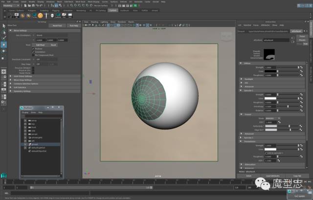 至此模型部分基本结束了,接下来导进MAYA简单调下材质看看效果,外层已经展过UV了,我在角膜和虹膜之间加了一层,这层是模拟房水,记得不要用封闭的体积,要用片,不然折射会有问题,导致瞳孔扭曲放大。