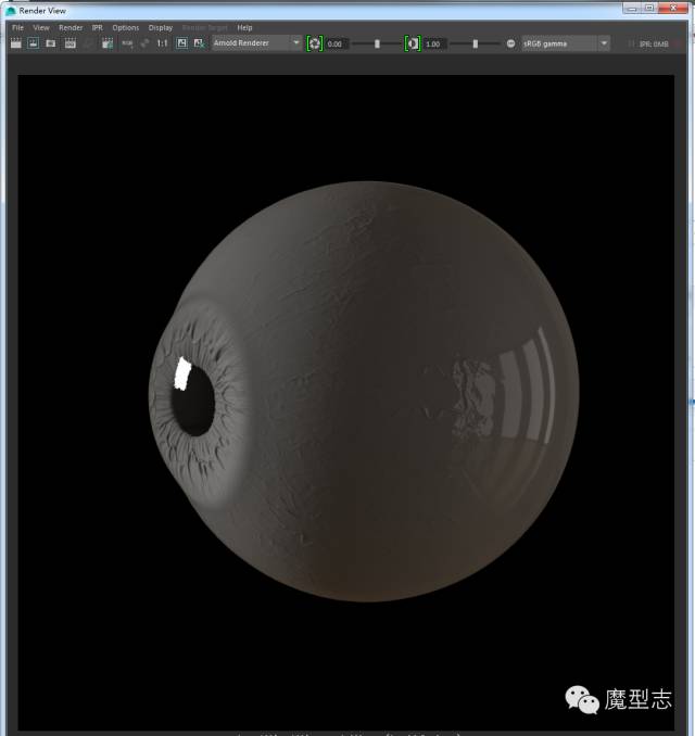 角膜和巩膜衔接位置和虹膜会有个夹角,这是产生投影的原因,这里会在虹膜上形成投影和AO效果,光线从斜上方打下来因为折射的关系,虹膜下方的边缘也会有少许投影,如果是通常把外层做成整体透明的做法,那你只能在虹膜上用贴图造假来模拟这种效果了,最后如果给角膜加上焦散的效果能够在虹膜上产生微弱的焦散光斑,来达到更真实的效果,不过阿诺德的焦散感觉很烂,也可能是我不会,如果有哪位大神知道怎么做请一定要告诉我。把眼球塞入还未完成的模型里看看,这里我在上下眼睑加了条泪线。