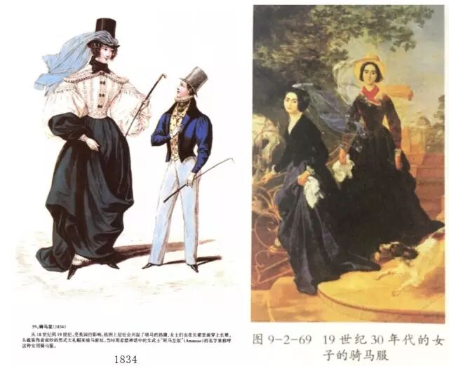 当时在上流社会的女性间还流行一种运动项目——骑马,所以自然而然也出现了女性专用骑马服。女性会戴高筒礼帽,系上男士克拉巴特(cravate)——也就是领巾,上身穿有羊腿袖的男士上衣,戴鹿皮手套,下身是宽敞的长裙里穿上用细棉做的紧身马裤,脚穿长筒靴。