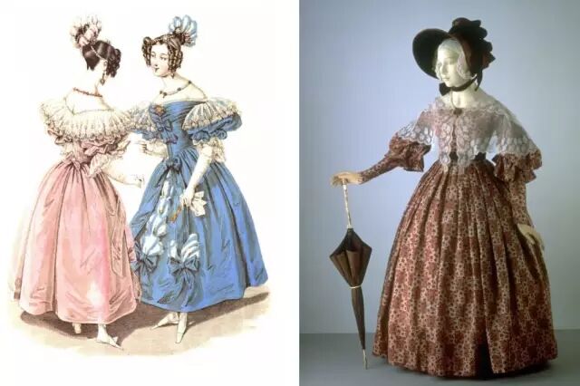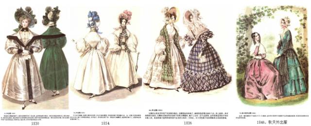 ▎1830年:降到自然位置,腰又被紧身胸衣勒细,袖根部极度膨胀化,裙摆向外扩张,成为X形。裙子上出现很多褶裂,其量感通过在里面穿数条衬裙不断加剧。