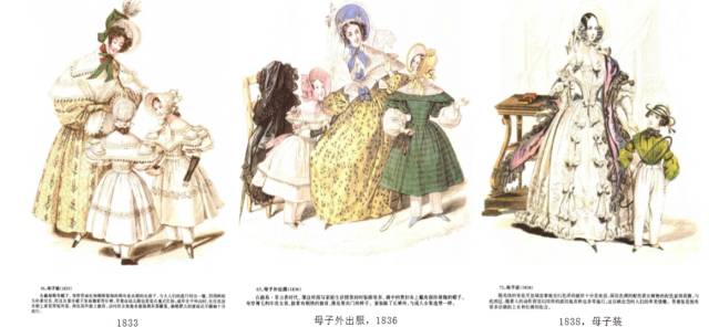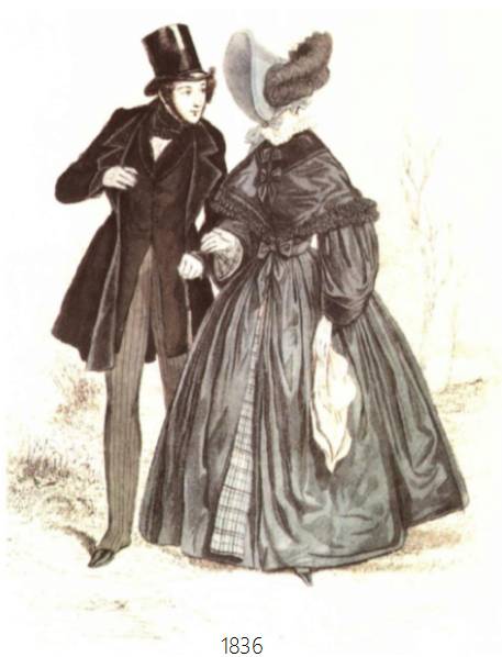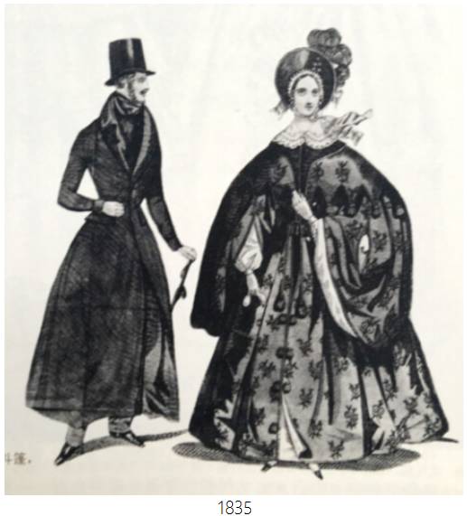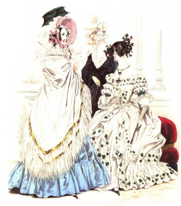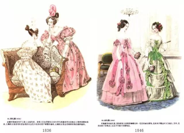 晚礼服:可以从浪漫主义中期(1836)—晚期(1846)的对比看出,从中期开始,袖子慢慢的变小直至晚期,回归于自然和正常的状态,但是裙子的体积变的更加饱满。