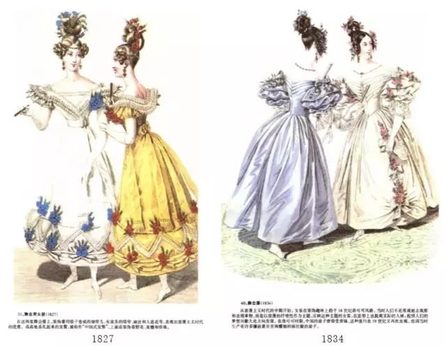 舞会服:可以看到浪漫主义早期(1827)—中期(1834)的明显变化:肩部袖根极度膨胀,裙子长度变长、体积变大。