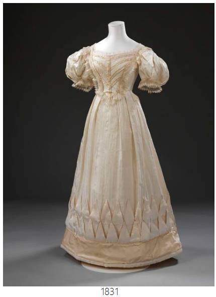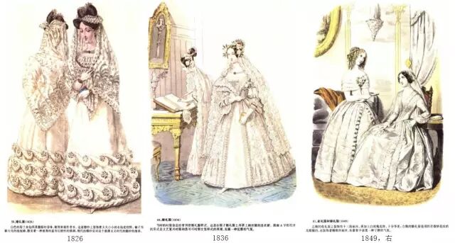 婚礼服:1826-1849,袖根从小到大再到小,裙子体积越发饱满。