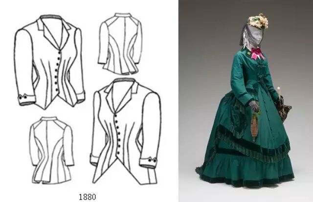 ③分开两件式:指的是仿男式的前开式上衣+裙子组成的两件式,上衣有紧身上衣夹克(jacket bodice)和巴斯克衫(basques)、丘尼克(tunic)、帕尔特(paletor)等等。