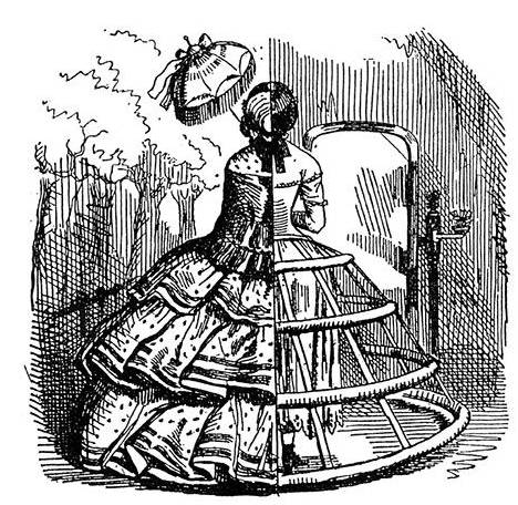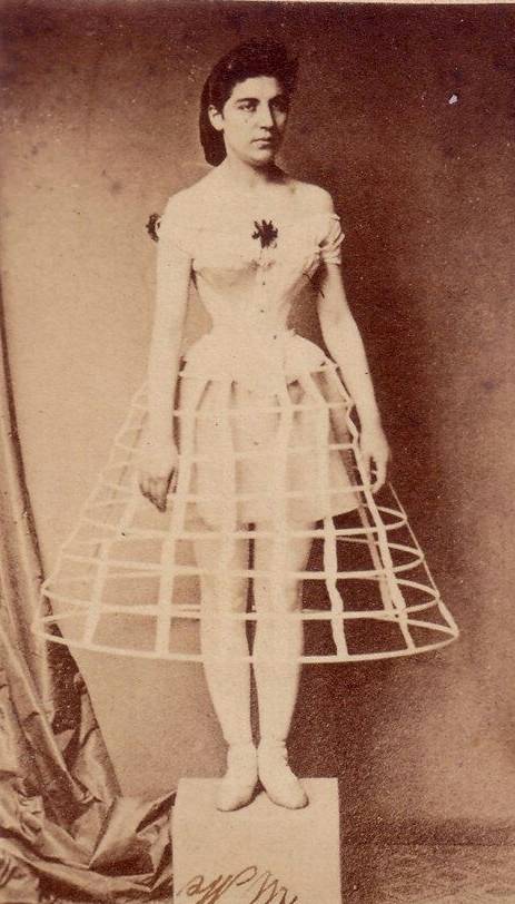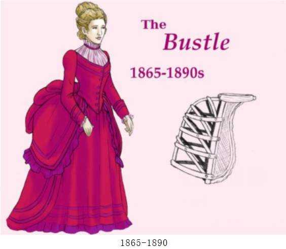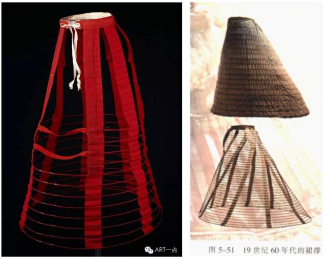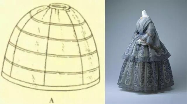 - 1850:此时的裙撑稍稍拉长呈鸟笼状,材料一般使用鲸须,细铁丝,藤条做轮骨,用带子连接。