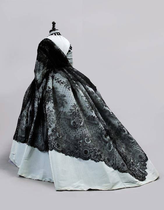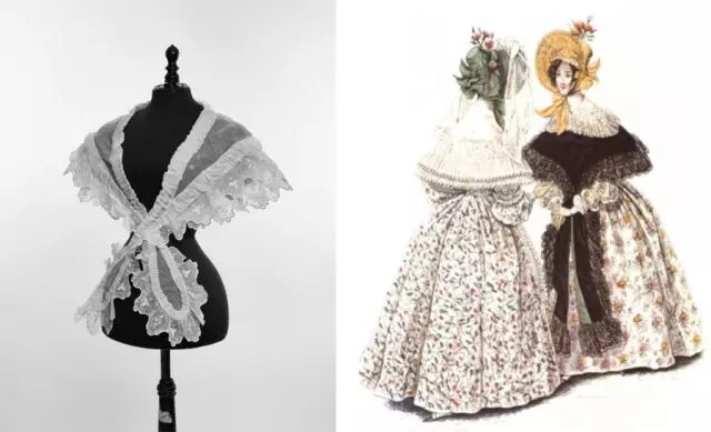那时候的女性流行在裙子外披一件曼特莱(mantelet)——也就是小斗篷。 它的特点是纱制,边缘有蕾丝边饰,前摆长长地拖裾在前面,颜色一般是黑或白。