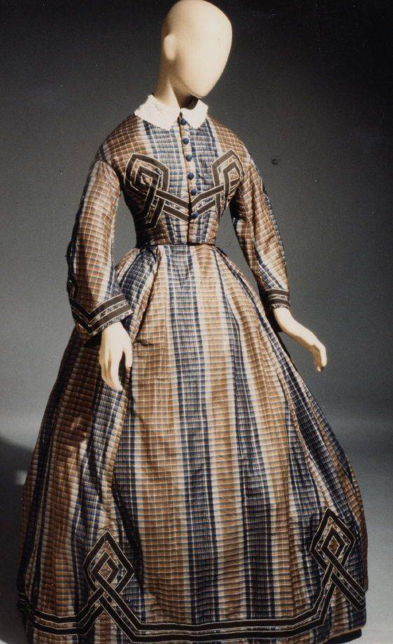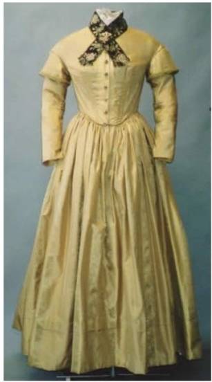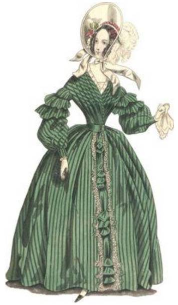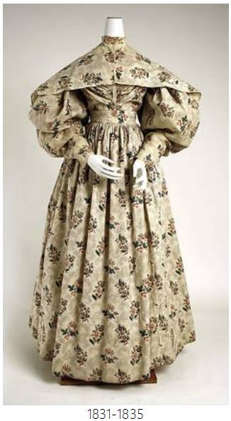 日常服装:与前一时期——浪漫主义时期的不同之处主要在于袖子变小、裙摆变大。