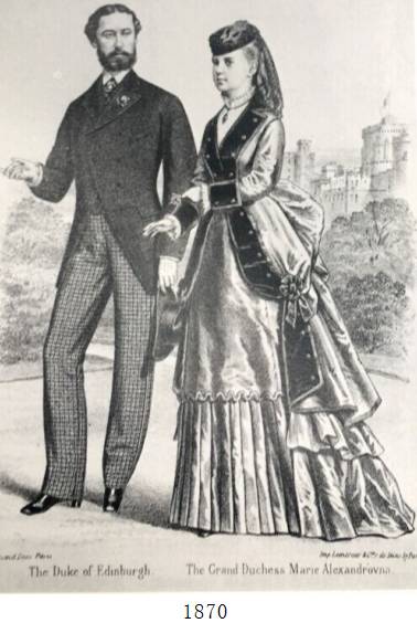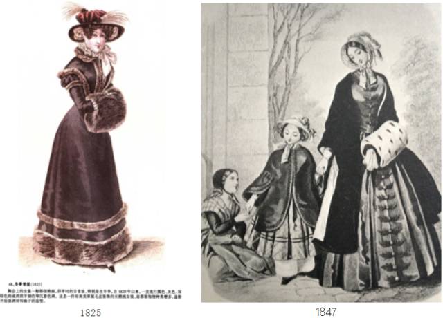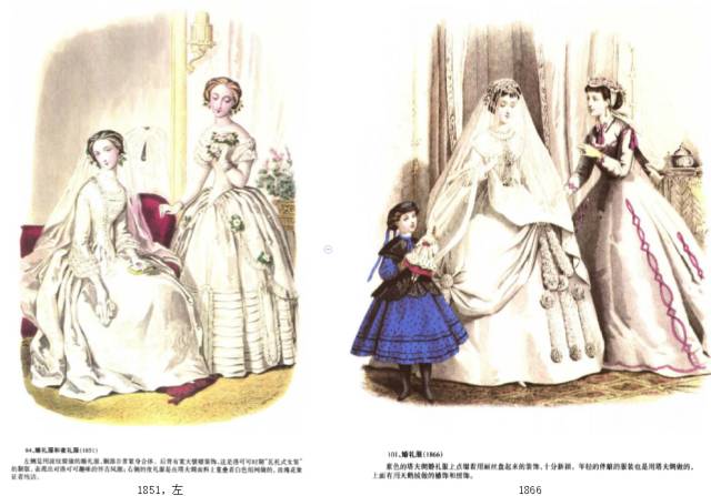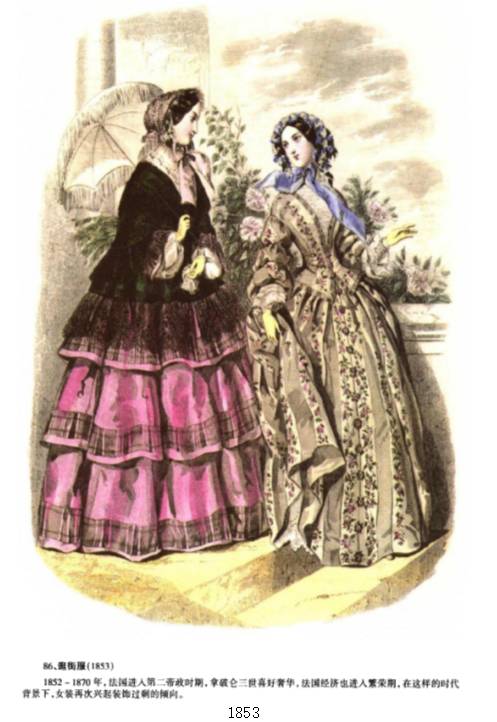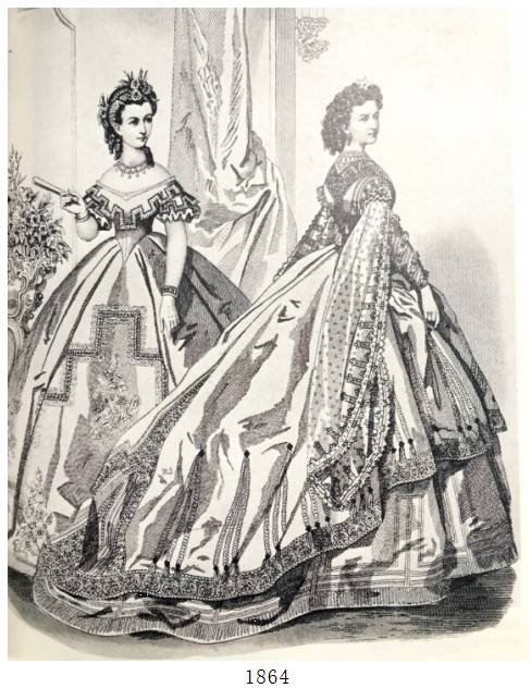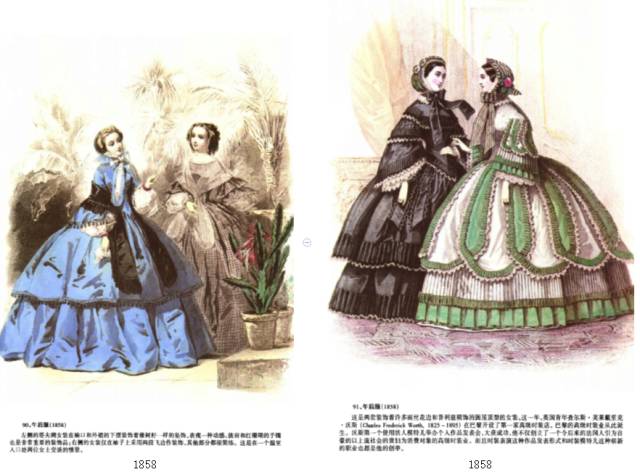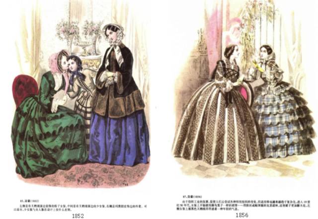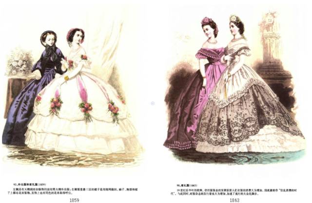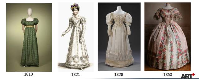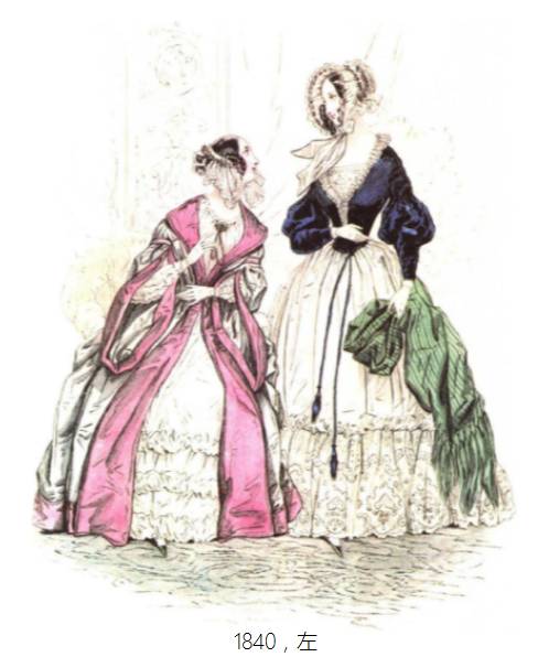 与前一时期——浪漫主义时期的不同之处主要在于袖子变小、裙子体积变大,面料更加华贵。