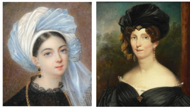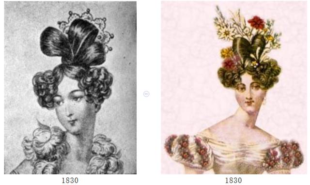 - 1830年:头顶挽成发髻,且越来越高。