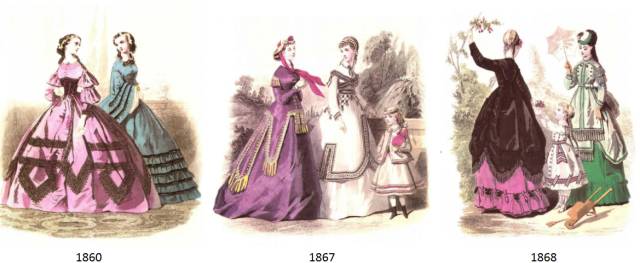 可以明显看到,裙撑先是从1850年左右的圆顶屋形演变成1867-1872年的向后斜金字塔形,最后变成了巴斯尔时期(Bustle)的臀垫。
