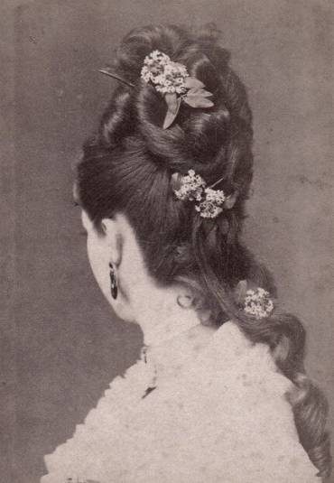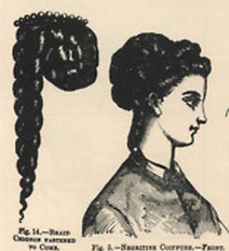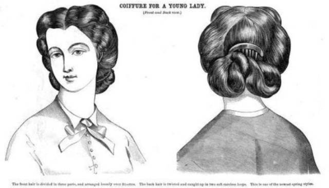 - 1860-1865:发髻位置增高 变大 最后位于头顶 头发呈瀑布落下的发卷。