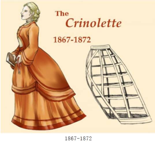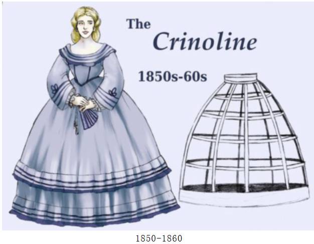 克里诺林(Crinoline):浪漫主义晚期的时候,由于裙子体积变大,里面的衬裙常达到5、6条之多,女性穿这么多层裙子十分不便,于是出现了裙撑这个东西。与比过去多层粗布垫相比,撑箍群衬在轻便的同时,也使女性的腰部更为苗条。由于裙撑的复活,裙子上的装饰也越来越多。