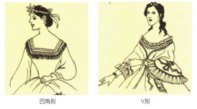 低领口的特点是常加有很大的翻领或重叠数层的飞边、蕾丝边饰。