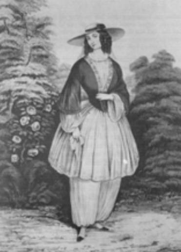 ①布鲁姆样式("Bloomer" dress):这个样式是布鲁姆夫人在1850年左右带入英国并试图推广,但是由于造型与当时的大审美相违背,被大部分人拒绝并嘲笑。现在看来,这位夫人真是一位有想法,敢打破常规的女子。它由简化版紧身上衣(bodice)、长及膝盖下方的非常宽大的裙子和灯笼裤(baggy trousers)组成。