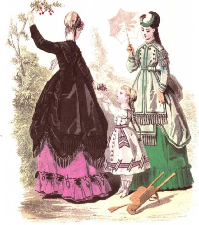 ④波兰风样式:1870之后的两三年流行波兰风样式。外形特点是用四五个隐藏的带子把外侧的罩裙卷起,露出里面的衬裙。流行没多久它就被巴斯尔样式给替代。颜色常用淡褐色、橄榄色、琥珀色、香子兰色这几种颜色。