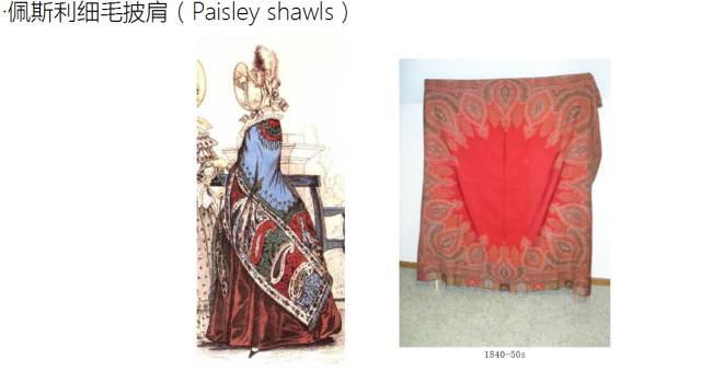 披肩:当时主要流行卡波特(capote) 佩斯利细毛披肩(Paisley shawls)两种披肩。