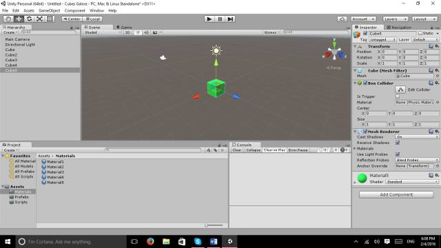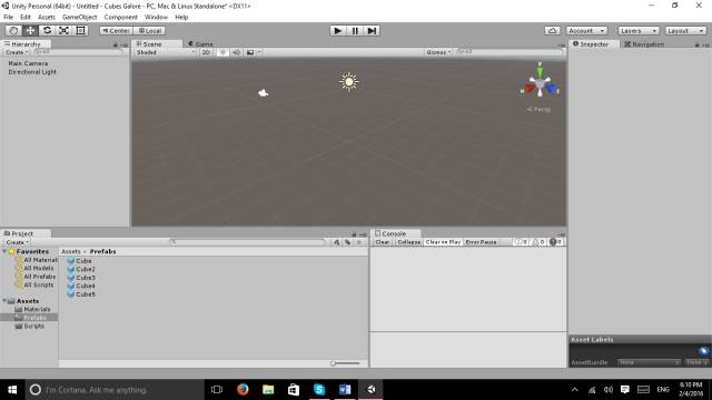 为这5个立方体分别使用对应的5个不同颜色的材质,然后将它们从层级视图拖拽至项目视图的Prefabs文件夹下,保存为预制件后,从层级视图删除它们: