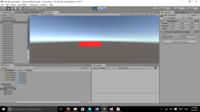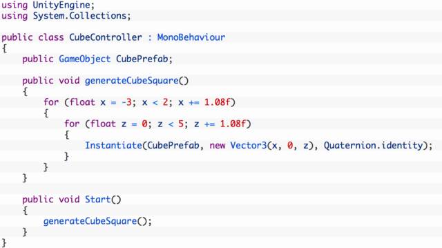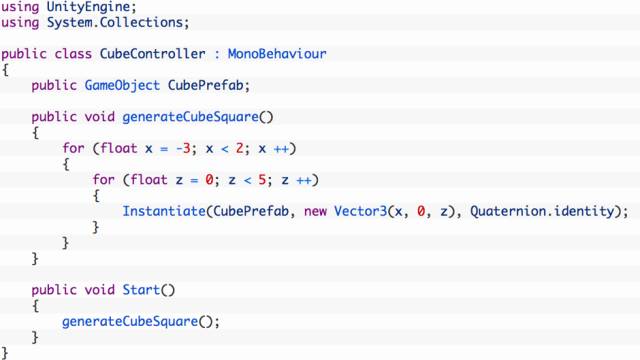 这个步骤将介绍利用单个预制件生成多个立方体对象,并形成一个方块。这里需要计算新生成的各个立方体的位置,会用到一点几何知识。