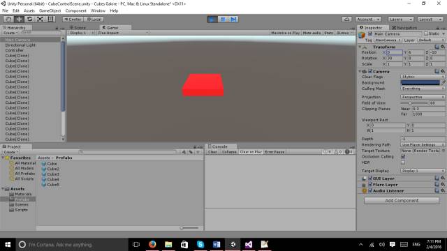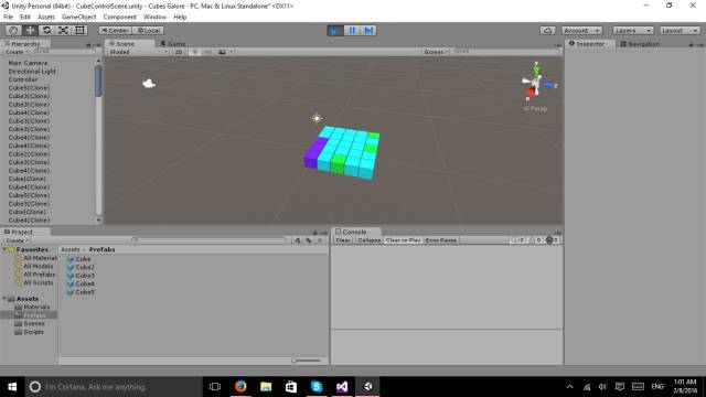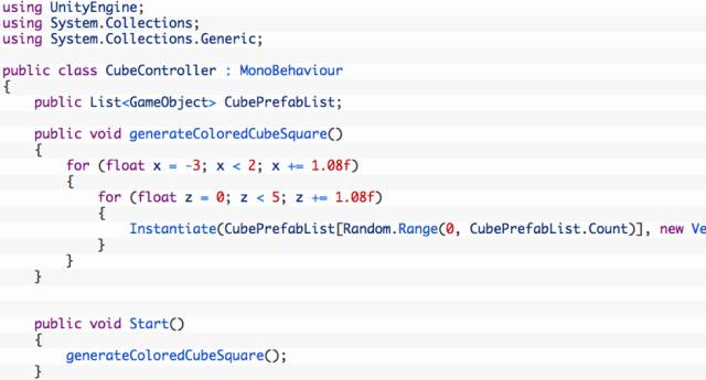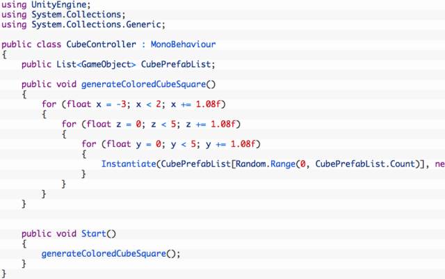 利用步骤一中新建的5个立方体预制件,使用不同颜色的立方体来生成方块,修改脚本代码如下:
