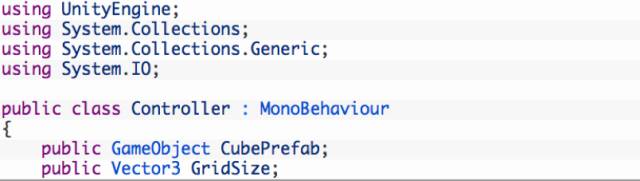该步骤将新建Controller脚本,来实现一些与CubeController脚本不同的功能。这里不再使用固定的x、y、z值来生成固定数量的立方体,而是可以在编辑器中修改这些值。这样无需更改代码,就可以在编辑器运行模式下查看不同的结果。先声明两个变量: