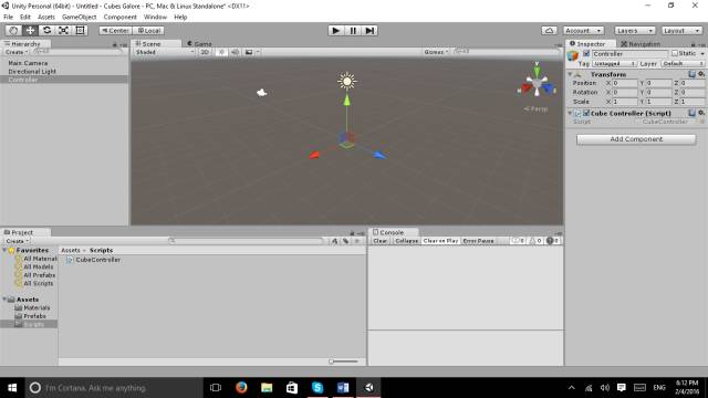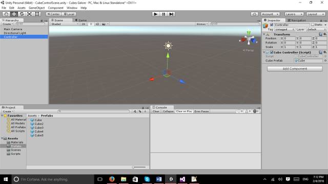 在Scripts文件夹下新建C#脚本命名为“CubeController”,将CubeController脚本绑定到Controller对象上: