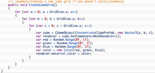 第一个CubePrefab变量就是CubeController脚本中的预制件,仅使用一个预制件动态改变颜色。GridSize是生成立方体在三个维度上的数量,可以在编辑器中指定不同的值。