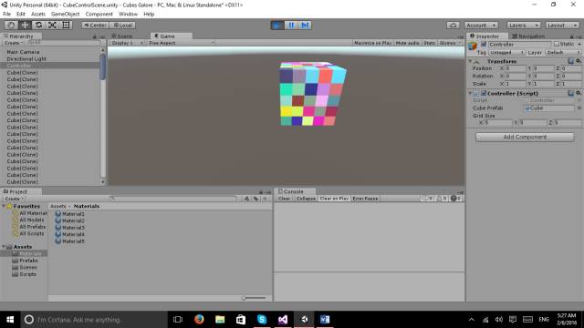 CreateCubeGrid方法用于创建立方体,三次循环的次数取决于编辑器中GridSize的值,每次增量为1。在循环中,创建临时变量cube用于生成立方体,利用Quaterion.Identity保证所有立方体的旋转与预制件保持一致。临时变量renderer用于为立方体随机赋予材质以显示不同的颜色,然后创建三个颜色分量,使用随机数生成不同的颜色。最终效果如下: