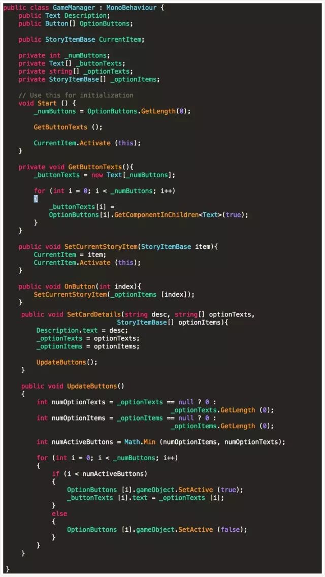 这个管理器用于承载整个剧情的发展,其作用是将目前的“故事卡”状态更新到UI上,在不同按钮按下时做出对应的动作,并引导剧情前进。这个管理器也需要一个“故事卡”来作为故事的开端。以下是GameManager脚本的内容:
