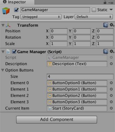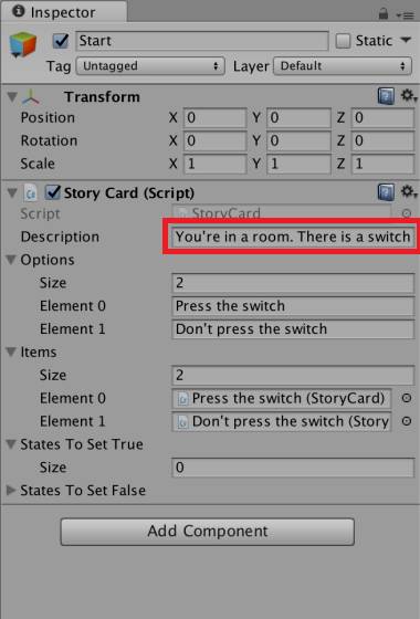 您需要在StoryCard脚本的Description字段中输入卡片描述(玩家可以在屏幕上看到的文本)、玩家在选项按钮上看到的文字(目前该程序最多支持4个按钮)、以及按下对应按钮后跳转的故事卡(即为分支,稍后会介绍)。
