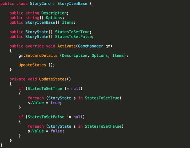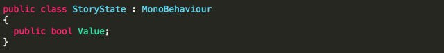 前面提出了“故事状态”的概念用于存储状态值,这其实只是一个布尔值容器。卡片在被激活时可以根据需要对特定的状态进行赋值。新建StoryState脚本,代码如下: