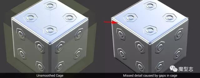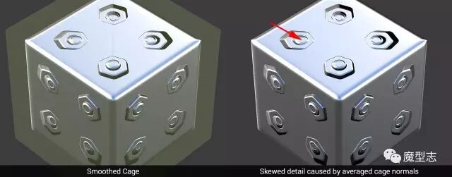 Unsmoothed cage是使用低模的模型法线方向进行包裹,这种方法会导致边缘出现接缝,通常不推荐使用,但是这种方法主要的好处在于可以减少偏斜的细节(如图箭头),然而Toolbag的skew paintng tool可以很轻松的处理这个问题。