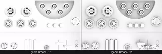 Ignore Group忽略组的选项将在不同的模型组块之间投射AO,大家看上图就能够很好的理解。这有助于将复杂对象的各个部分对准,如果你有某些元素可用于拆卸或者单独的动画,例如枪支等,你可以将Group组关闭,这样他们就不会接收到组件的Ao。