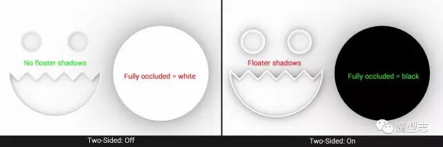 Two Side选项将通过高模的Back side面去投射AO,这对于精确的烘焙两个模型想交接的部分是非常理想的,但是对于悬浮模型细节的Ao烘焙就不会太理想,会导致悬浮片周围有阴影,对于复杂的模型Ao烘焙,比较好的方法是烘焙Two side关闭和打开两个设置的AO,然后在通过Ps进行拼合。