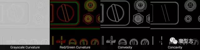Curvature 烘焙将输出凸度以及凹度图,默认情况下,Curvature烘焙出的图为灰色,其中凹型细节更亮,而凸的部位更暗,Curvature可用于生成划痕,凹陷的污垢等一些效果。
