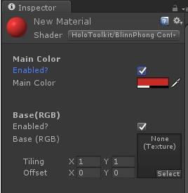 依次点击Unity编辑器菜单Assets -> Create -> Material新建材质。在着色器字段中,单击下拉菜单,找到HoloToolkit - > Lambertian Configurable Transparent。HoloLens应用首选着色器就是HoloToolkit附带的着色器。Lambertian Configurable Transparent着色器可选择红色,这里设为(200,43,38)。