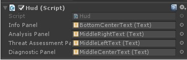 选择HUD对象,然后在检视面板中,单击Add Component -> New Script新建脚本命名为“Hud”。双击Hud.cs在Visual Studio中编辑脚本。在脚本的顶部,创建四个公共变量:InfoPanel、AnalysisPanel、ThreatAssessPanel和DiagnosticPanel。它们将用于保存对项目中的Text对象的引用。