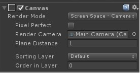 在检视面板选择HUD画布查看其属性,来配置摄像机锁定视图。将画布的Render Mode字段值设为Screen Space - Camera。然后将Main Camera从层级视图拖至画布的Render Camera字段中,作为画布被锁定的相机视图。