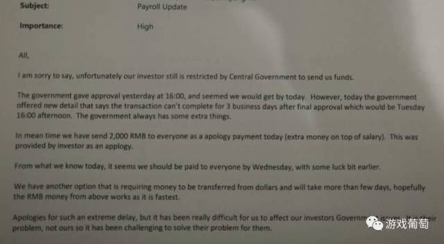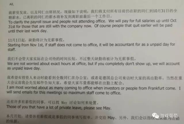 2016年的7月底是个周末,工资没发,当时也没在意。过了两天后,我们收到了Crytek中国负责人Adam Lang的邮件,他说德国总部没钱了,工资没有打过来,要拖延一段时间。