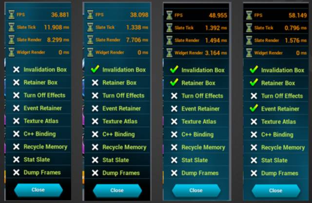 大部分的 UI 优化工作(比如说 Invalidation Box, Retainer Box)都是在项目后期( UI 基本开发完成后)再进行的。UE4 提供了很丰富的功能和调试工具,熟练掌握这些功能能够帮助开发者实现高性能的UI。