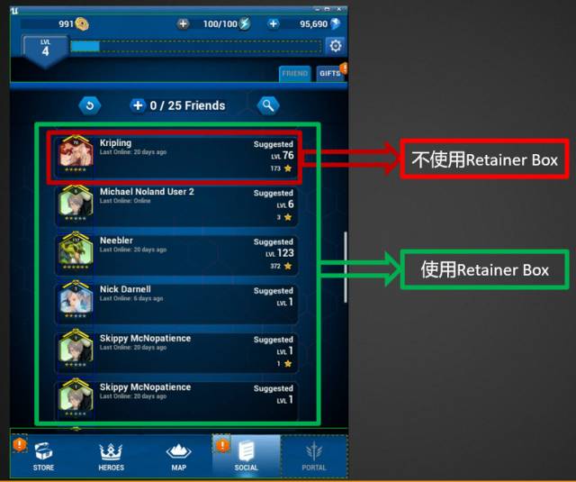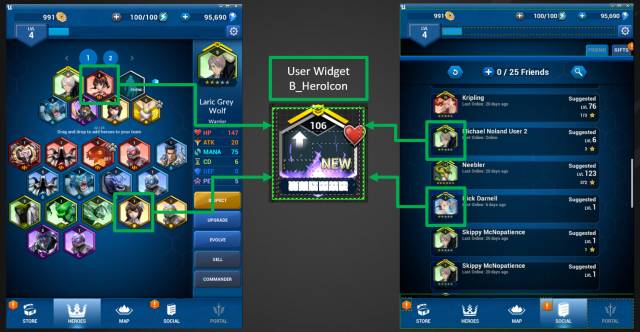 下图演示了另外一种情况,B_HeroIcon 这个 User Widget 被重复用到了 HEROS 和 SOCIAL 等多个主界面中。Battle Breakers 是一个重 UI 的手机游戏,因此很难为所有的主界面分配 Retainer Box,这会占用大量的显存,当然我们也不希望为每个 B_HeroIcon 创建一个 Retainer Box。