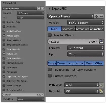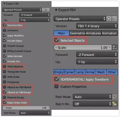 现在,在左侧面板(默认设置)中更改一些Export OBJ /Export FBX设置:
